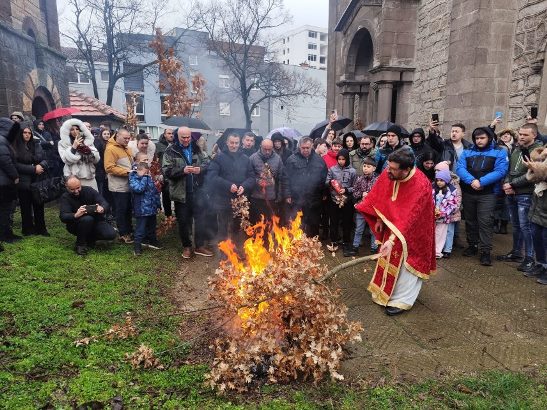 Након литургије и причешћа, испред храма је обављено паљење бадњака.