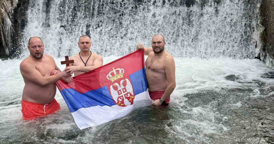 Саша Милосављевић, Перица Герић, Сима Русимовић, Стајко Поповић, Саша Ђорић, Милан Јанићијевић и Петар Чаначевић након свете лигургије у Штрпцу, подно Шар планине храбро су ушли у хладну воду реке Миљоштице по Часни крст.