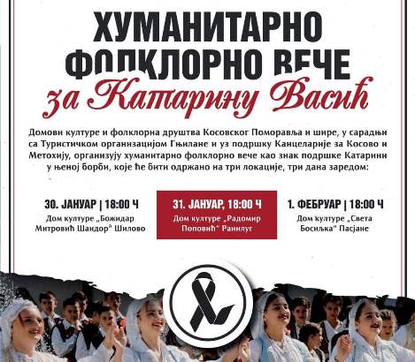 Домови културе и фолклорна друштва Косовског Поморавља и шире, у сарадњи са Туристичком организацијом Гњилане и уз подршку Канцеларије за Косово и Метохију организују хуманитарно фолклорно вече као знак подршке Катарини Васић у њеној борби.